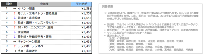 関東エリアの平均時給は1,219円(前月比10円減、前年比3円増)、東海エリアの平均時給は1,155円(前月比1円増、前年比54円増)、関西エリアの平均時給は1,240円(前月比4円増、前年比23円減)、九州エリアの平均時給は1,146円(前月比20円減、前年比149円増)となりました。
