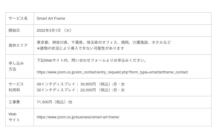JCOM株式会社(J:COM、本社:東京都千代田区、代表取締役社長:石川 雄三)は、2022年3月1日(火)より新サービス「Smart Art Frame」を東京都、神奈川県、千葉県、埼玉県の法人を対象に開始します。