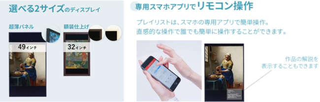 アート作品は、1948年創刊の美術専門雑誌『美術手帖』を発行するカルチュア・コンビニエンス・クラブ株式会社(本社:東京都渋谷区)CCCアートラボがセレクトした世界の名画や、株式会社The Chain Museumが運営するアート・コミュニケーションプラットフォームArtStickerがセレクトした現代アート、風景写真などの作品群を揃え、さらに感性科学を研究する慶応義塾大学川畑秀明教授にも監修頂き各種プレイリストを実装しています。これによりユーザーは、好みの絵画を投影して鑑賞したり、集中したい時、リラックスしたい時、アイデアを生み出したい時など利用シーンに合わせて空間を演出することができます。