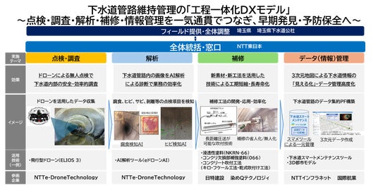 本取り組みでは、下水道管路維持管理に関する専門技術を持つ各社が技術開発・検証を行い、NTT東日本は全体統括を担います。各社が連携し、各工程で発生する下水道管路全体のマネジメントに必要な情報をデジタルで接続することで、工程を一気通貫でつなぐ「工程一体化DXモデル」構築に共同で取り組みます。