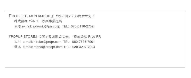 『COLETTE, MON AMOUR(コレット・モン・アムール)』は2019年末のパリでのプレミアを皮切りに、ロンドン、N Yで限定プレミアとイベントを開催。東京では2020年9月26日(土)から10月8日(木)、渋谷PARCO8Fの映画館(WHITE CINE QUINTO)限定で公開となる。