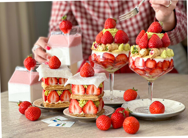 旬のいちごをふんだんに使用した「あまおうの贅沢ブリュレパフェ」は、サクサクのバタークリームパイに濃厚ピスタチオクリーム、ザクザク食感のチョコクランチやカリッと香ばしいブリュレなど、一口、二口食べ進めるごとに変化する味と食感をお楽しみいただけます。「あまおうとピスタチオのミルフィーユパイ」は、キャラメリーゼしたパイにピスタチオクリーム、カスタードクリーム、フレッシュいちごをたっぷり使用、仕上げに求肥をトッピングし、モチモチ食感をプラスしました。いちごの甘酸っぱさとピスタチオの香り、求肥のモチモチ食感が絶妙な逸品です。両スイーツともに福岡県産あまおうを贅沢に使用しております。お得なドリンクセットもお選びいただける、いちごの果肉たっぷりの「いちごミルクぱっく」はキュートな牛乳パック風のグラスでご提供いたします。味はもちろん、見た目にもこだわりぬいたインスタ映え抜群の絶品いちごスイーツを是非ご賞味ください。