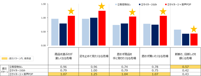 これまでの結果から、脳血流という無意識的なデータからも、アンケート調査という意識的な評価からも、視覚と聴覚、特に聴覚を刺激する販促物によって、お客さまが「興味関心」や「自分ゴト化」に関する脳活動を活性化させながら、より楽しくお買い物していただける体験に繋がりやすいという示唆を得られました。