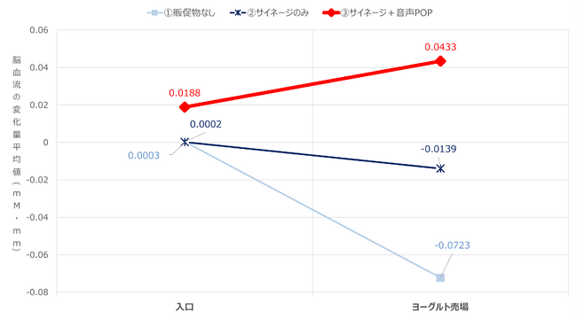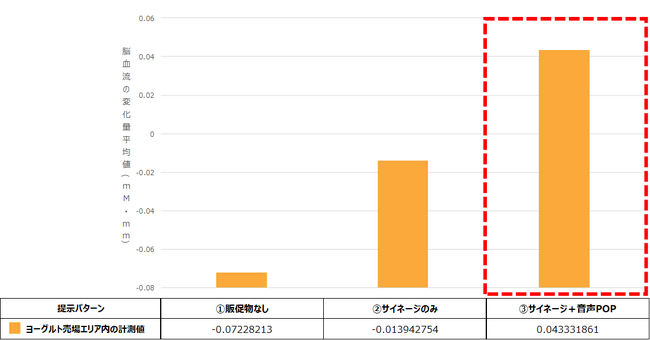 また、入口とヨーグルト売場の「興味関心・自分ゴト化」に関する脳血流計測値を比較したところ、販促物が何もない売場や視覚刺激のみを設置した売場では計測値の低下が見られるのに対し、視覚・聴覚を刺激する販促物双方を設置した売場では計測値が上昇するという結果が得られました。
