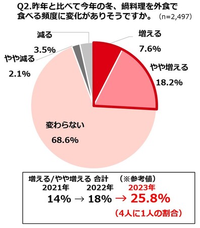 ・鍋料理を外食で食べる頻度は4人に1人が「増える」と回答。理由は「鍋料理が好きだから」が最多。