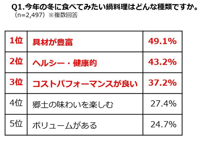 ・食べてみたい鍋料理の種類は「具材が豊富」「ヘルシー・健康的」「コスパが良い」がTOP3。