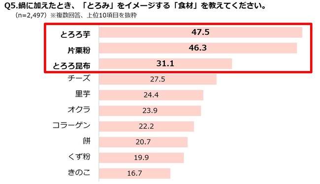 ・鍋に加えた時に「とろみ」をイメージする食材は「とろろ芋」「片栗粉」「とろろ昆布」がTOP3。