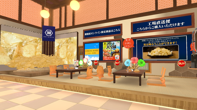 さらに、通常は湖池屋のECサイトでしか購入することのできない「湖池屋工場直送便 ポテトチップス」や、この夏の新商品がバーチャルマーケット内で特別限定価格にて販売されますので、楽しみにお待ちください。