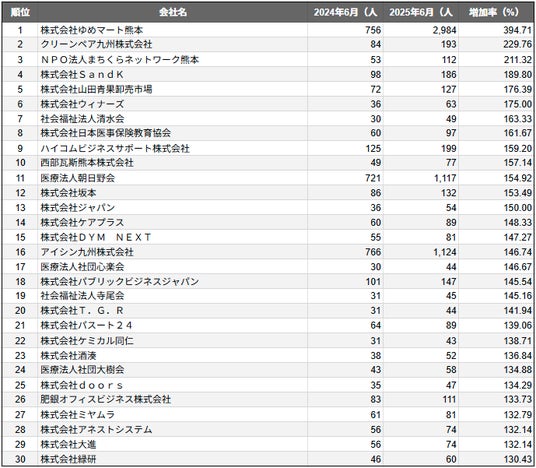 株式会社SalesNow(本社:東京都渋谷区、代表取締役:村岡功規、以下「当社」)は、国内540万社の企業情報を完全網羅した日本最大級のデータベース「SalesNow DB」より、人口の多い上位30都市を対象とした「従業員数増加率ランキング」を発表しました。本リリースでは、各都市別のデータをもとに、今回は「熊本市に本社を置く企業」を対象に、従業員数の増加傾向にフォーカスします。