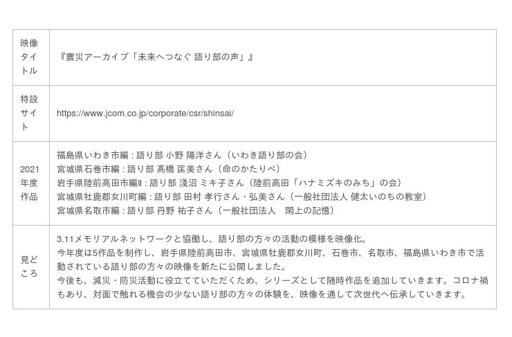 JCOM株式会社(J:COM、本社:東京都千代田区、代表取締役社長:石川 雄三)は、震災の記憶や教訓を風化させることなく、次世代に伝えていくために、2022年2月28日(月)より、震災伝承の連携組織「3.11メモリアルネットワーク」と協働で語り部の活動を映像化した『震災アーカイブ「未来へつなぐ 語り部の声」』を、J:COMの特設ホームページおよびJ:COMオンデマンドにて無料配信いたします。
