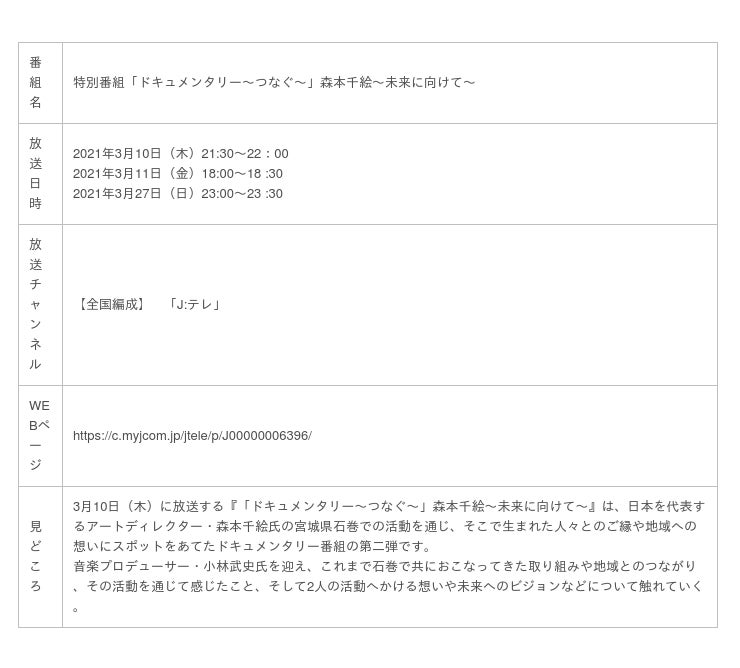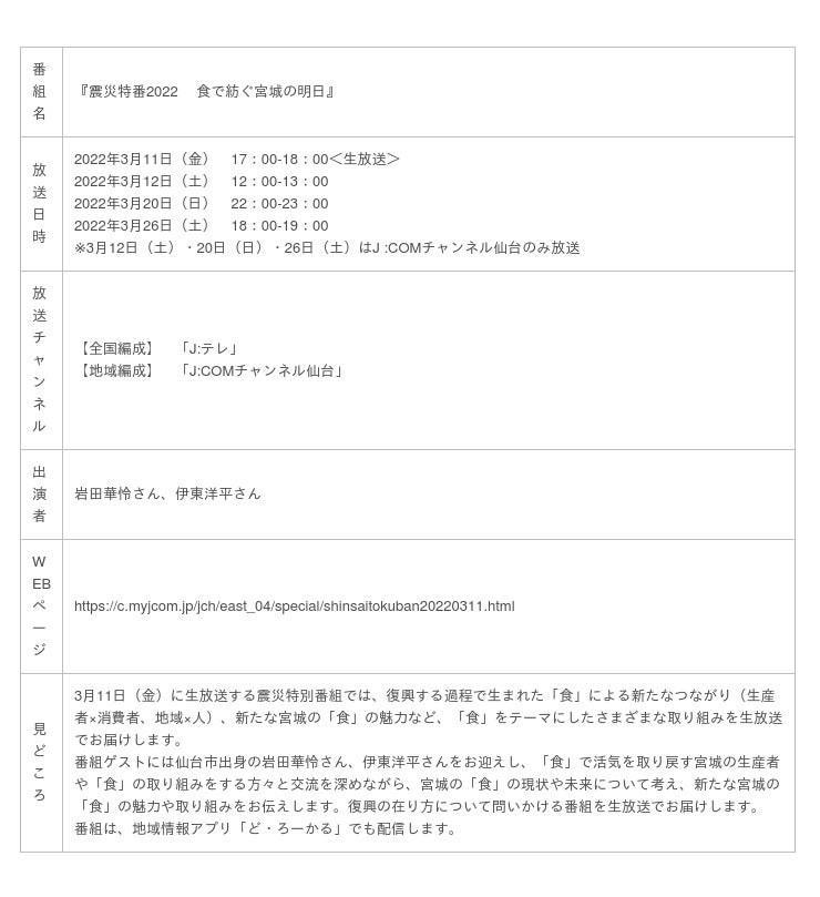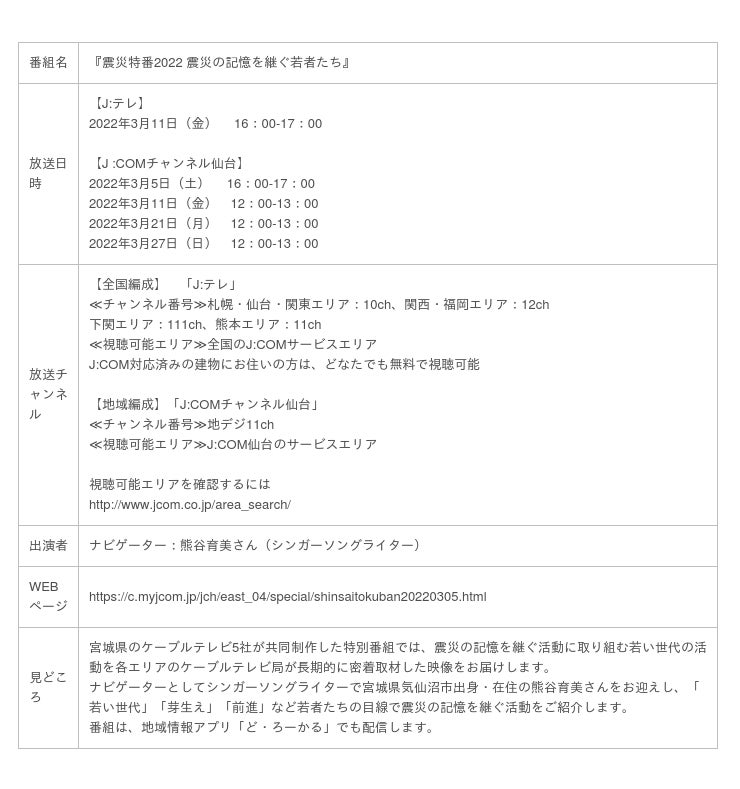 さらに2022年3月に、J:COMが制作した『震災特番2022 食で紡ぐ宮城の明日』と『「ドキュメンタリー~つなぐ~」森本千絵~未来に向けて~』、日本ケーブルテレビ連盟 東北支部5社で共同制作した特別番組『震災特番2022 震災の記憶を継ぐ若者たち』の3番組を全国 1,400 万世帯で視聴可能な J:COM のコミュニティチャンネル「J:テレ」で放送します。