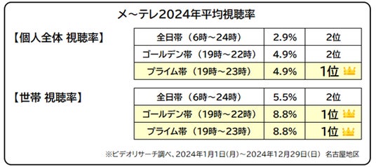 メ~テレ(名古屋テレビ放送)は、2024年の年間平均視聴率で、個人全体はプライム帯トップ1冠、世帯はゴールデン帯・プライム帯の2冠を獲得しました。年間の平均視聴率で個人全体のプライム帯、および、世帯のゴールデン帯とプライム帯の両方が1位となったのは、2013年以来となります。
