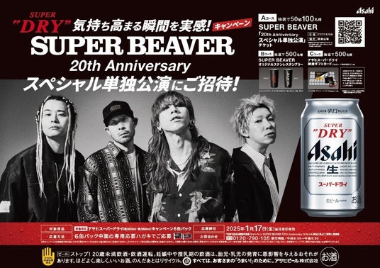 WEBCMの配信に合わせ、2025年6月に開催されるSUPER BEAVER主催のライブ「SUPER BEAVER 20th Anniversary スペシャル単独公演」のチケットなどが当たるキャンペーンを実施します。抽選で50組100名にライブチケット、500名にオリジナルタンブラーなどが当たります。対象のキャンペーン6缶パックを購入すると、応募ができます。