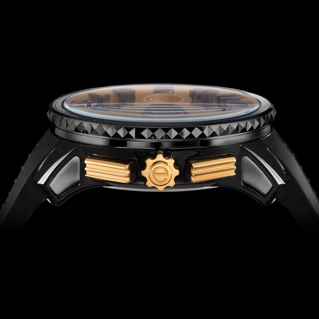 立体的なインデックス、ケースサイドにはピラミッド型の意匠。リューズ周りにもゴールドを配置。