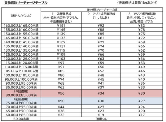 JALは、2025年8月1日から適用となる日本発国際貨物燃油サーチャージを国土交通省へ申請しました。基準となる2025年6月のジェット燃料の平均価格が1バレルあたり84.70米ドルであったことから、燃油指標価格を「80.00以上85.00未満」とし、サーチャージ額は1kgあたり56円(米州・欧州など遠距離路線)、34円(アジア遠距離路線)、30円(アジア近距離路線)となります。