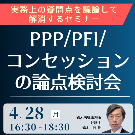 JPI(日本計画研究所)は、鈴木法律事務所 弁護士 鈴木 良 氏を招聘し、PPP/PFI/コンセッションの論点について詳説いただくセミナーを開催します。