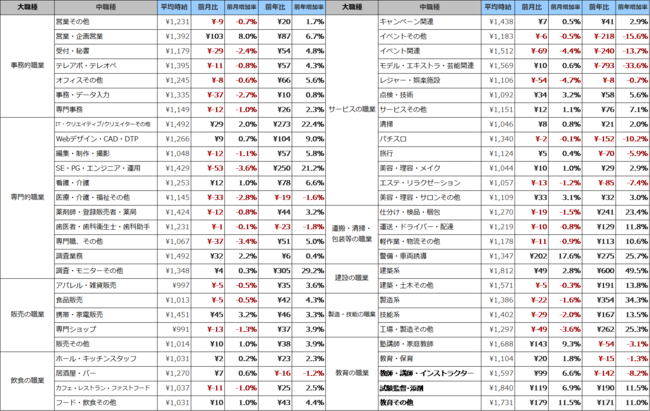 全国の平均時給について、事務的職業は1,341円(前月比2円減、前年比56円増)、専門的職業は1,235円(前月比2円減、前年比37円増)、飲食の職業は1,032円(前月比3円増、前年比27円増)、販売の職業は1,056円(前月比25円増、前年比49円増)、サービスの職業は1,262円(前月比9円増、前年比7円増)、運搬・清掃・包装等の職業は1,255円(前月比16円減、前年比213円増)、建設の職業は1,678円(前月比18円増、前年比408円増)、製造・技能の職業は1,383円(前月比24円減、前年比346円増)、教育の職業は1,620円(前月比120円増、前年比55円減)となり、9職種中8職種が前年同月を上回りました。