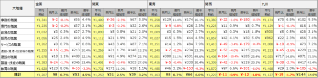 関東エリアの平均時給は1,250円(前月比31円増、前年比39円増)、東海エリアの平均時給は1,163円(前月比8円増、前年比66円増)、関西エリアの平均時給は1,229円(前月比11円減、前年比12円減)、九州エリアの平均時給は1,127円(前月比19円減、前年比144円増)となりました。