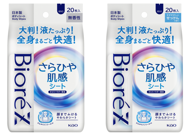 そこで、「ビオレZ」は、汗をかいても1日を快適に過ごせる「さらひや肌感シリーズ」を新たにご提案。お出かけ前に塗る『ビオレZ さらひや肌感ジュレ』は、ドライ&ひんやりヴェール技術を採用。汗でひんやり成分(メントール:清涼剤)が放出し、汗をかくたびに“ひんやり”感を実感できます。さらに、ドライパウダー(基剤)が汗を乾かし続けて、“さらっ”としたドライな肌状態を維持します。また、『ビオレZ さらひや肌感シート』は、外出時の急な汗に対応。ふいた瞬間は肌の“ひんやり”感を得られ(ひんやりメントールin(清涼剤))、ふいた後は、肌が“さらっ”とする仕上がり(さらりパウダー配合)。大判シート(当社比*約3倍)で液たっぷり(当社比*約2倍)の設計なので、今まで何枚も使っていた人も、1枚で全身ふきとれます。*ビオレさらさらパウダーシート比