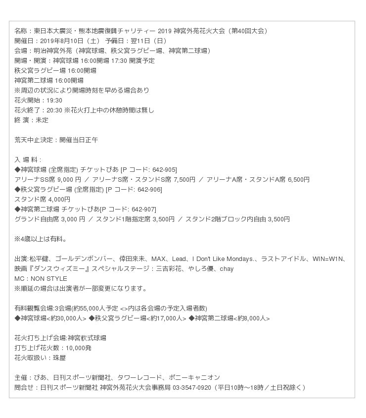 「2019 神宮外苑花火大会(第 40回大会)」開催概要