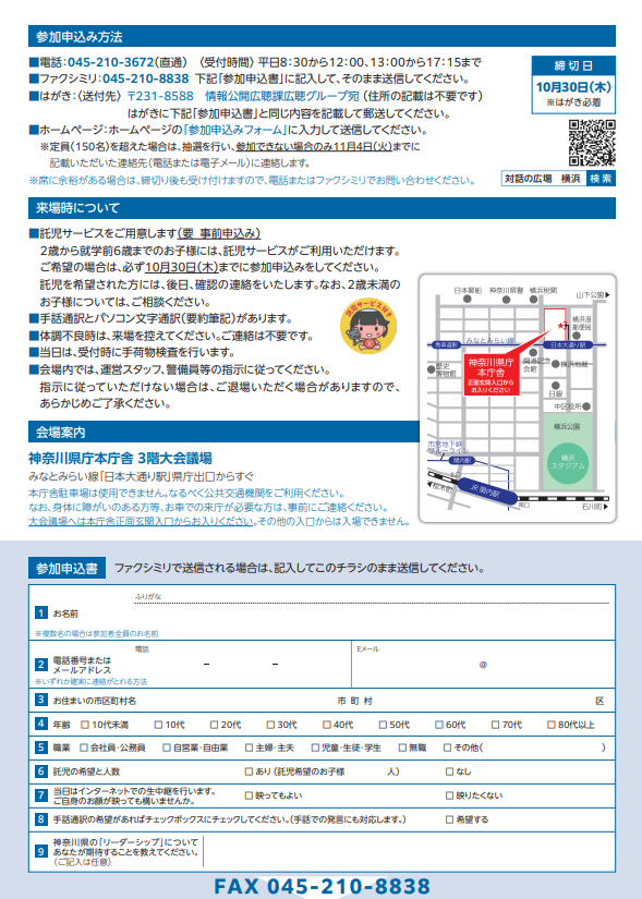 以下のURLをご参照のうえ、電話、ファクシミリ、はがき、県のホームページ(e-kanagawa電子申請)のいずれかでお申し込みください。応募が定員(150名)を超えた場合は、抽選を行い、参加できない場合のみ 11月4日(火曜日)までにご連絡します。