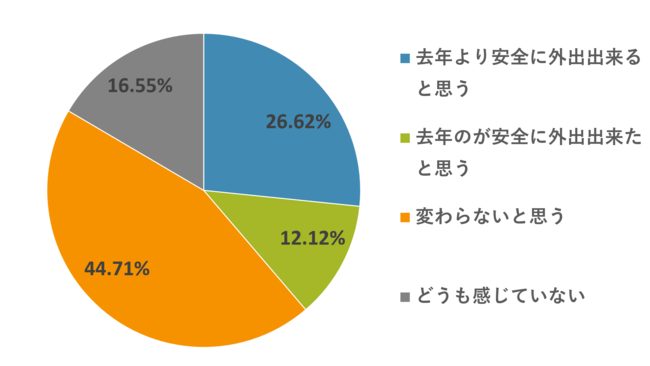 「去年と今年を比べコロナ禍でのゴールデンウィーク中の外出をどう感じていますか。」に対し、「去年より安全に外出出来ると思う 26.62%」「去年のが安全に外出出来たと思う 12.12%」「変わらないと思う 44.71%」「どうも感じていない 16.55%」と回答。