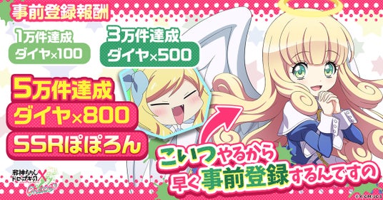 事前登録の参加件数に応じて、サービス開始時に豪華アイテムを全員にプレゼントいたします。事前登録件数が5万件達成で、ダイヤ800個&SSR仲間「ぽぽろん」が手に入ります。序盤から強力な仲間を獲得できるこの機会に、ぜひ事前登録をお願いいたします。