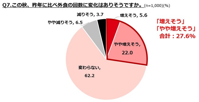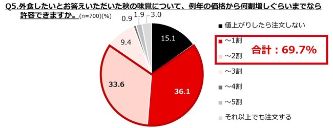 ただ、気になるのは値上げの影響。外食時の値上がりで許容できる範囲を伺ったところ、1~2割という回答が7割。極端な値上げでなければ多数が受け入れるようですが、今年は夏の猛暑の影響で栗や梨、松茸等が不作で高騰。消費者の皆さんの「食べたい欲」と「財布事情」のせめぎ合いになりそうです。