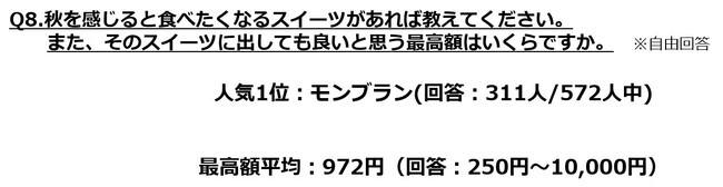 一方で、秋を感じると食べたくなるスイーツを尋ねると「モンブラン」が圧勝。「モンブラン」に出しても良い最高額を伺ったところ、5,000円以上の金額を書かれた方もちらほら。スイーツには財布の紐も緩む傾向にあるようです。