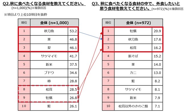 ・秋に食べたい食材は「秋刀魚」「栗」「梨」がTOP3、外食では「牡蠣」「秋刀魚」「松茸」が人気。