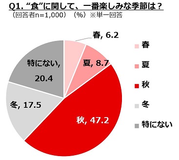 食に関して一番楽しみな季節は「秋」と回答する方は昨年同様に半数近く、圧倒的な人気に。「秋」と聞くだけで食べ物が浮かんでくる方もいらっしゃるのでは。