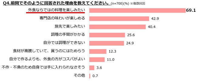 ・外食したい理由は「外食ならではの料理を楽しみたい」が7割でトップに。次いで「専門店の味わいが楽しめる」と「旅先で楽しみたい」が4割程度。