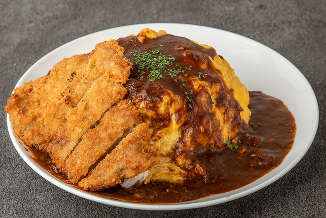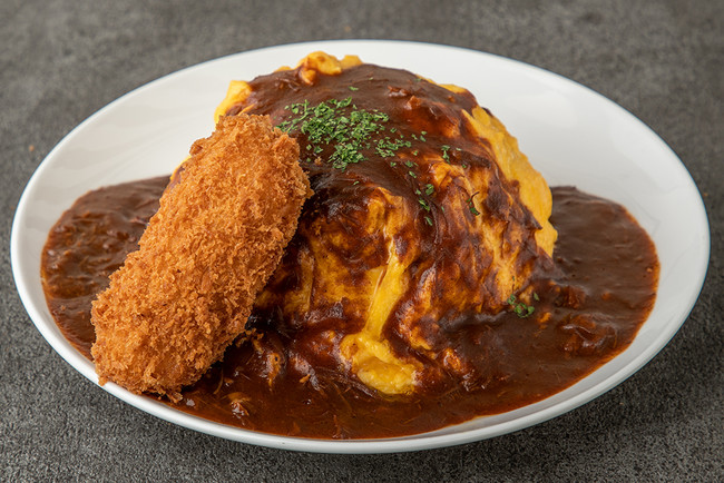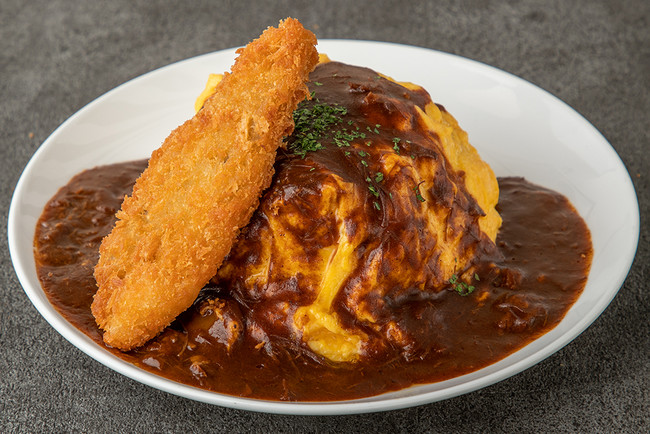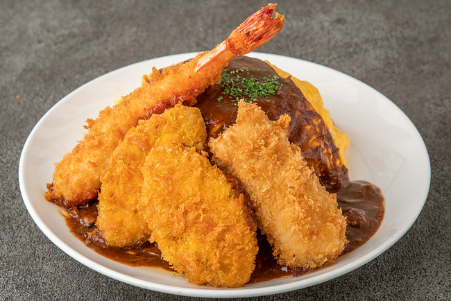 エビフライに蟹クリームコロッケ、さらに和牛メンチカツ2個を乗せてオムライスの上を覆い尽くした、洋食の人気スター勢ぞろいの“大人買い”ならぬ“大人様”なオムライス。3種類もの揚げ物たちとボリューミーなオムライスの組み合わせ、その背徳感を味わうのもまた、大人の楽しみ方…かも。