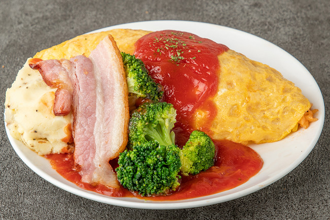 ジューシーな厚切りベーコンとホクホク&クリーミーなマッシュポテト、ビタミン豊富なブロッコリーの三者は、何気に最高なオムライスの付け合わせ。
