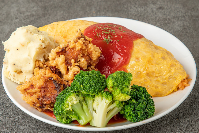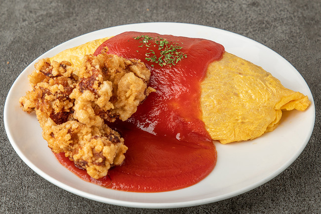 カスタマイズできるオムライスに、唐揚げ6個とスープが付いたディナータイム(15:00~22:00)限定のスペシャルセット。醤油ダレベースでにんにくもガツンと効いた唐揚げは、薄焼きでもふわとろでもどちらの卵とも、4種のどのソースとも相性が良く、唐揚げニストならば必見のオムライスです。