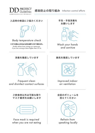 株式会社ダイヤモンドダイニングが運営する各店舗では、お客様に安心してお食事を楽しんでいただくため、行政が定める方針に基づいた感染防止対策を最大限に講じ「DD PROTECT Guidelines」として実施しております。
