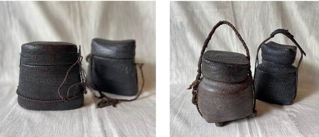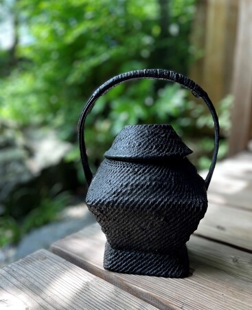 紙縒(こより)を編んで全体を漆で塗り固めたもの。軽くて硬い。花器などとして使えます。