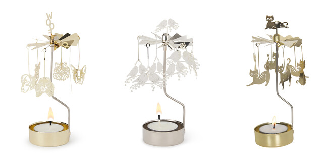 動物のファミリーが愉快に回転するキャンドルホルダー。火を付けたキャンドルをスタンドのホルダーに置くと、モビールが回転します。※キャンドルは付属しません。