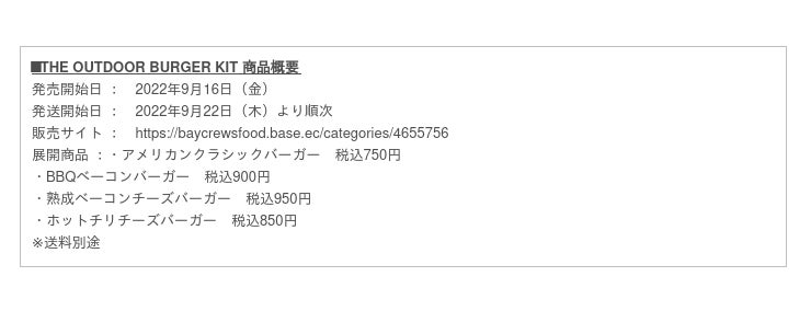 株式会社ベイクルーズ(本社: 東京都渋谷区、取締役CEO: 杉村 茂)が運営する、アメリカンスタイルのハンバーガーショップ「J.S. BURGERS CAFE」は、9月16日(金)よりアウトドア専用の手作りハンバーガーキット『THE OUTDOOR BURGER KIT』をオンラインショップ「BAYCREW’S FOOD MARCHE(ベイクルーズ フード マルシェ)」(https://baycrewsfood.base.ec/)で新発売します。