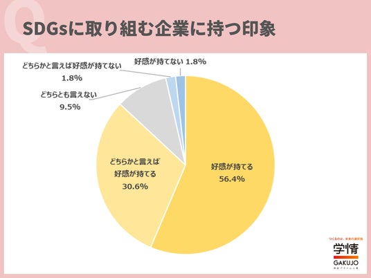 SDGsに取り組む企業について、「好感が持てる」と回答した生が56.4%に上りました。「どちらかと言えば好感が持てる」30.6%を合わせると、9割に迫る学生が「SDGsに取り組む企業は好感が持てる」としています。