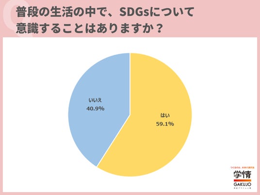 普段の生活で、SDGsについて意識することがあると回答した学生が59.1%に上りました。約6割の学生が、普段の生活の中でSDGsについて意識していることが分かります。「環境に配慮した製品や、SDGsに積極的に取り組んでいる企業の製品を購入するようにしている」「エコバッグやマイボトルを持参するようにしている」「食材を買い過ぎないようにする、賞味期限が近いものから食べるなど、食品ロスの削減に取り組んでいる」「身の回りのモノをなるべく長く使うことで、無駄な消費を減らすようにしている」などの声が上がりました。「子ども食堂のボランティアに参加している」など、自身で積極的なアクションを起こしているという声も寄せられました。