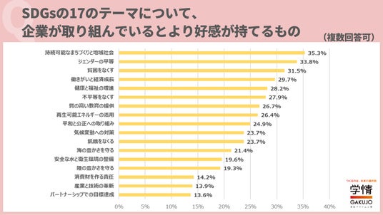 SDGsの17のテーマで、企業が取り組んでいると好感が持てるものは、「持続可能なまちづくりと地域社会」が35.3%で最多。次いで、「ジェンダーの平等」33.8%、「貧困をなくす」31.5%が続きました。「自分や身近な人の暮らしに直結するテーマを重視している」「企業は個人よりも取り組みによって生まれる影響力が大きいため、規模の大きい課題に取り組んでいるほうがより好感が持てる」などの声が寄せられました。
