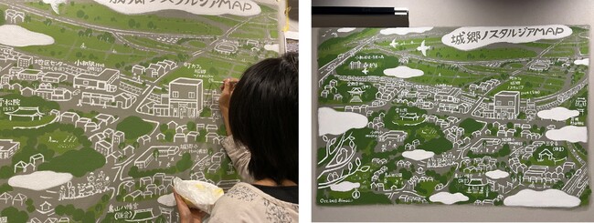町に愛着を持ち、町に関わるきっかけとなるよう、イベントのチラシ等を掲示できる手作りのインフォメーションスペースを備えるとともに、町の歴史を知ってもらうきっかけとなるよう、壁面には地域の絵地図が描かれています。