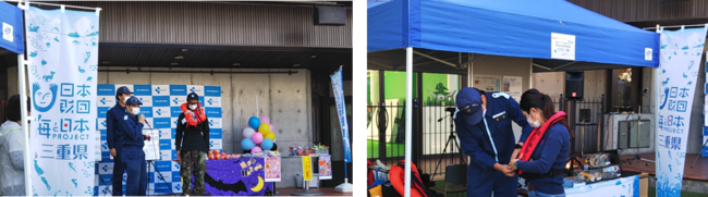 その後、四日市海上保安部の職員による「海難事故にあってしまったときにどうしたらいいか」、「固形式救命胴衣と膨張式救命胴衣について」講演が行われました。講演では救命胴衣の着用による安全性を伝えた上で、「万が一、まわりで海に落ちてしまった人を見かけたら、迷わず118番へ連絡して助けを呼んでください」と呼びかけました。特に、ボンベの力で空気を入れて膨張する「膨張式救命胴衣の体験」では、その急激な膨張に体験者は驚きの表情を見せていました。イベント後は、「海と日本プロジェクトin三重県実行委員会」のブースでも、ライフジャケットや救命胴衣の体験、海に落ちていたごみを展示しました。参加者からは「(膨張式救命胴衣が)思ったよりしっかりふくらむことに驚きました。それでいて持ち運びやすい」などの感想が飛び交っていました。
