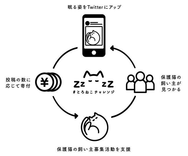 「#とろねこチャレンジ」は、この事実をたくさんの人に知ってもらい、投稿数に応じた寄付金を「保護猫の飼い主募集活動」に活用することで引き取り手を増やし、その分の殺処分を減らすために始まりました。