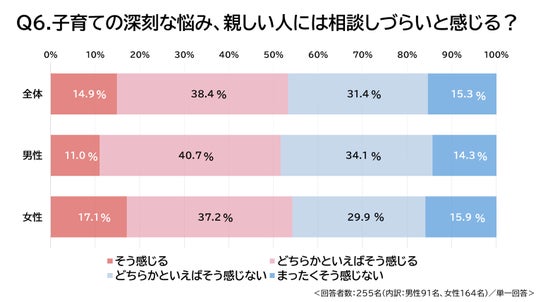 しかし、親しい人に相談できるかといえば必ずしもそうではなさそうです。「子育てにおいて深刻な悩みが発生したとき、親しい人に相談しにくいと感じたことはあるか」という質問に対し、「そう感じる」と回答した方が14.9%、「どちらかといえばそう感じる」と回答した方が38.4%で、合計53.3%の方が相談へのハードルを感じているようです。