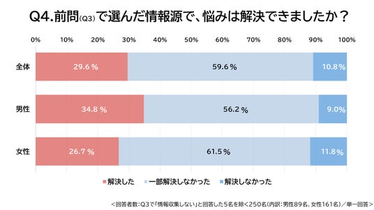 「前問で選択した“最初の情報収集手段”で悩みは解決できたか」を尋ねたところ、59.6%が「一部解決しなかった」、10.8%が「解決しなかった」と回答し、合わせて70.4%が十分に解決できていない実態が明らかになりました。多くの子育て世代の悩み解決手段は、インターネット検索やSNSなど“手軽なネット情報”に頼りつつも、それだけでは答えにたどり着けていない状況が推察できます。