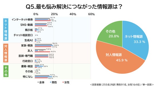 実際、「最も悩み解決につながった情報収集手段は何か」という質問に対して、最も多かった回答は「家族・親族」で18.4%、次いで「インターネット検索」16.1%、3番目が「医師・専門職」14.5%という結果でした。Q3と同様、分析をわかりやすくするため、回答を『ネット情報源』、『対人情報源』、『その他』の3カテゴリーに再編成して集計すると、『対人情報源』が45.9%で最多となり、『ネット情報源』は33.3%にとどまりました。