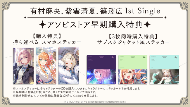 株式会社バンダイナムコエンターテインメントは、絶賛配信中のスマホ向けアプリゲーム「学園アイドルマスター」に登場する、有村麻央、紫雲清夏、篠澤広の1stシングルを2024年9月25日(水)に発売することを決定しました!6月19日(水)より各法人にて予約を開始します。