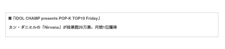 『IDOL CHAMP presents POP-K TOP10 Friday』4月の放送回の総合投票数で決まる月間1位はカン・ダニエルの「Nirvana」となり、4月のMVPとして番組内で放送されました。